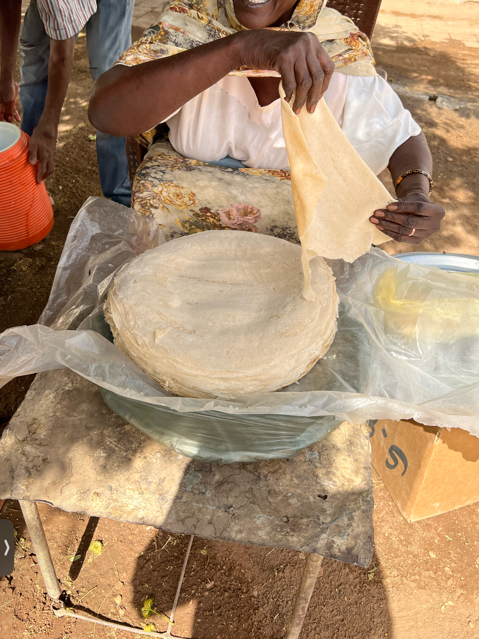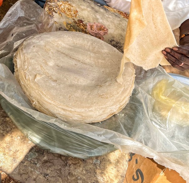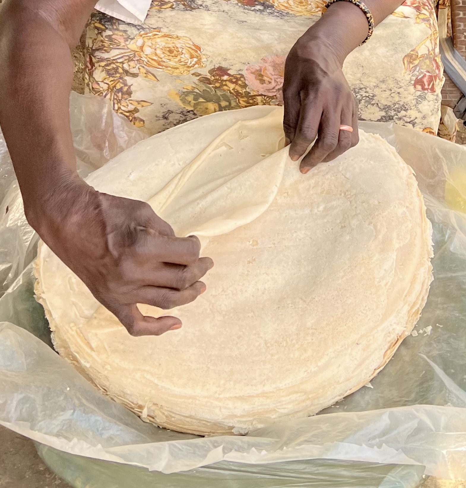 Kisra, with its slightly peppery, sour tang, makes a delicious base for Sudan’s iconic mulah and tabikh, vegetable and meat gravies, soups and stews, such as Umm Shi’eifa and the cured meat dish, shamūt. It is also wonderfully portable; in Northern Province in the past, children would often be went off on long trips with snacks wrapped in kisra.