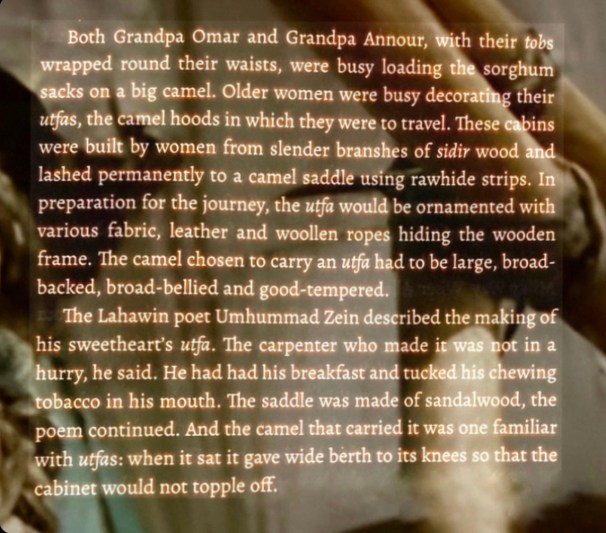 The Hawdaj, also known as JaHfa or ‘uTfa in classical Arabic, is a camel-borne litter crafted, assembled and adorned by Sudanese women. It is reserved for the exclusive use of women and children and plays a central role in seasonal migrations of the nomadic camel herding peoples, abbāla, of both western and eastern Sudan. The term shibriya, sometimes used to denote the wooden framework of the canopy, is also used to refer to the litter as a whole and in particular to that used by female elders. The excerpt below is taken from Hamid Dirar’s gripping memoir of a nomad childhood among the Shukriya people; The Amulet.