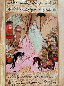 Above, a line from just one of the many popular songs and poems celebrating the beauty of the hawdaj and the woman enthroned within. Here a would-be suitor implores the maiden concealed in the glowing drapery of the litter; “oh rider of the shibriya, I call on God that you might have mercy on me (for) I am departing the city in the tracks of my herds (literally, following my livestock).