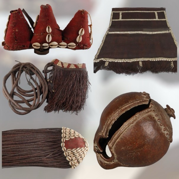 Top left, composite head ornament for a camel:- three coiled basketwork cones of vegetable fibre, covered with red cloth and ornamented with cowries, attached with leather straps, top right, leather throngs woven into a large sheet, one end of which is sewn round a sandalwood stick, with the other end composed of a fringe of unplaited thongs. Middle left, a branded leather camel halter. Bottom left, a composite tassel, made of plaited leather thongs, ornamented with cowries with triangles of red velvet. Bottom right. a cast bronze Indian cattle bell, purchased from the neck of a Tuareg camel in western Sudan.