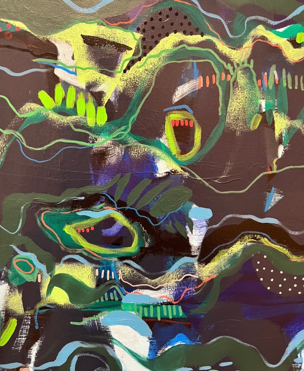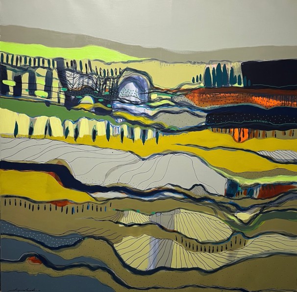 “Her works feature undulating gestures let loose across the picture plane, with luminous colors, hues of deep blues and shadowy blacks as well as grassy spring greens, suggesting an interplay between land, water, air, flora and fauna.” Schulting Art Collection