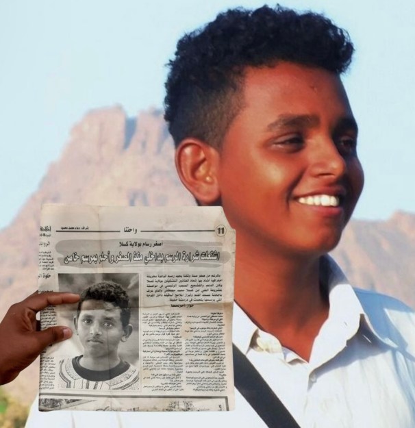 Above, the artist to a backdrop of the Kassala hills. Insert, a newspaper article, entitled The Youngest Artist in Kassala State, tracing Mohammad’s fascination for art from an early age. See self-portraits here and Self-portrait. Mohammad’s irrepressibly positive attitude to life and art – “let’s create joy and peace with our hands” , his delight in floral motifs in unexpected contexts, can be seen too in his playful self-portrait with flowers
