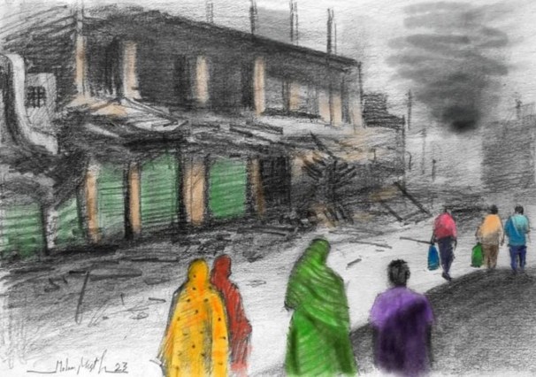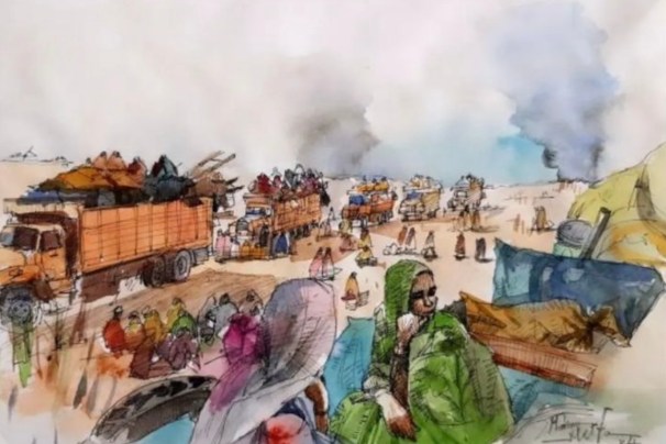 Mohammad was studying at the College of Fine Arts, Sudan University of Science and Technology when war broke out in April last year. Since then he has sought to explore new artistic forms while using the power of art to “convey my country’s voice to the world.” Mohammad documents the toll of the conflict on civilians in arresting and moving ways and many of his works have been referenced in Sudanese news sites and social media.