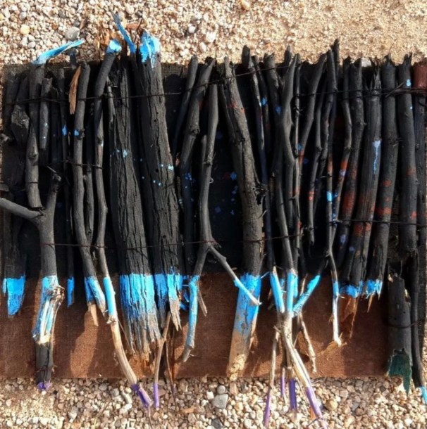 Title photo and above, detail of one of Mohammad’s recent works exploring the relationship between humans and the natural world and “the transformations they undergo”. The careful, ordered assemblage of charred twigs in the piece above speaks of human fragility amidst chaos, our struggles to cope and our resilience. The sky blue hints of “hope and renewal despite ashes and destruction.” Mohammad Mustafa. Learn more about this poignant work in continuity despite chaos