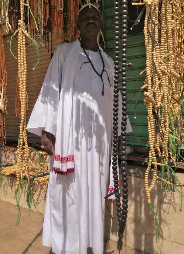 Below, a prayer bead seller near Souq Al-Arabi holds up a traditional wooden Sudanese sibHa, favoured by Sufis and which bears a hundred beads. The typical sibHa is thread with 33 or 99 beads for the blessed names of Allah. The longer sibHa has two smaller divider beads, or “shadid / shawaahid”, literally witnesses, at every 33-bead interval. The dividers can also take the form of small oblong wooden or bone beads. The two ends of the sibHa are joined by a longer, turned wooden handle bead, known as a minaret for its shape, or alif, representing the name of God. The Sufi sibHa also bears tongues of beads threaded on string or cord as seen below. These usually hold ten beads and are used to help the worshipper keep count of his hundred and ultimately thousand prayers. These are called jaraaya.