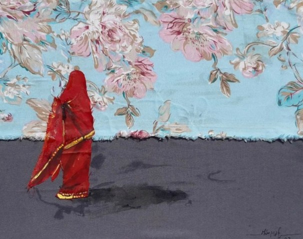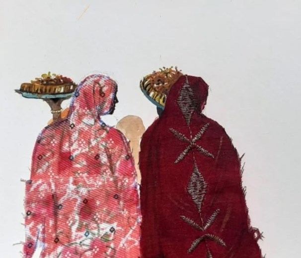Above, a graceful figure swathed in traditional red and gold jirtig wedding toub glows against a horizon of blossoms; one of Mohammed’s recent works combining textile, paint and collage. When war erupted in the Sudanese capital last year, fine arts undergraduate, Mohammad Mustafa Abu Al-Hassan, pictured below, lost his studio and everything in it. Forced to flee Khartoum, Mohammad, or Mo, Mustafa sought the relative safety of Kassala in Eastern Sudan. There, this gifted young artist has taken to experimenting with collage, textiles and natural materials.