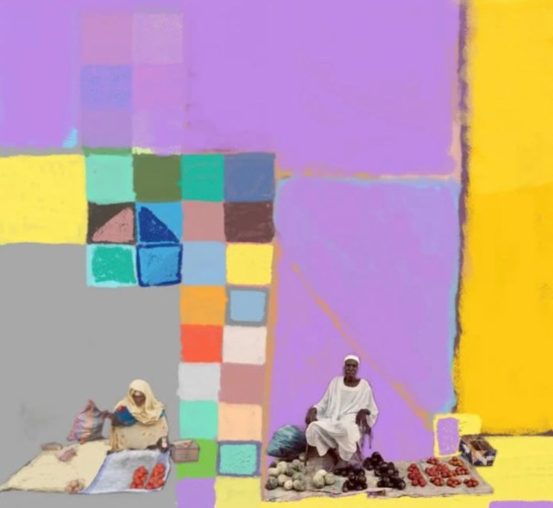 Mohammed is determined to express the tragic impact of Sudan’s war in his work while always holding on to faith in his people’s ability to rebuild their homeland and their lives. Although his work delves into the brutality and waste of war, his message is ultimately uplifting. Commenting on the work below – “a call to create a new reality full of hope and optimism”, Mohammed explains “This artwork embodies the spirit of Sudan rising from the dust of war to once again pulse with life and beauty…as the vendors go about their daily lives in harmony with the colours that fill the background.” He goes on; “The colours here are not just passing details; they symbolize the joy that will fill Sudan after the hardships…”