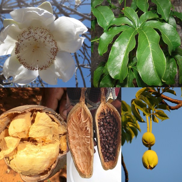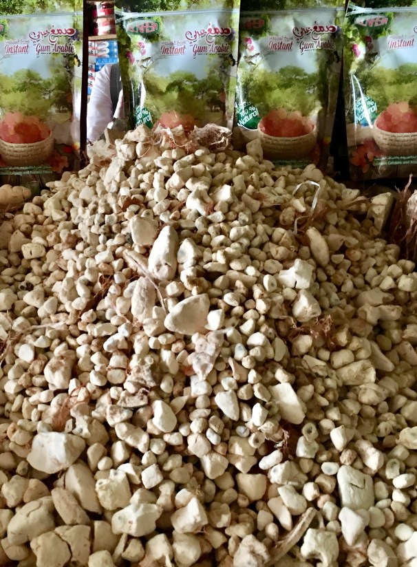 Above, zesty nuggets of baobab fruit pulp, at a stall in Souq Al-Arabi, Khartoum, pre-war. These may be eaten whole as sweets, or used to make the famous gongoleez Ramadan drink. Title photo, the leaves, fruit and flowers of the baobab tree, photo Wikicommons.