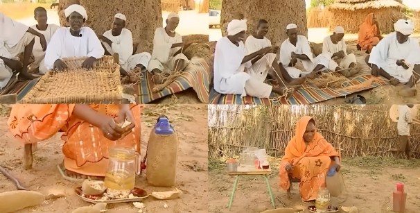 Below, scenes from Aljazeera Live report on the Kordofani tebeldi, showing the weaving of mats and beds using tree fibres and the preparation of gongoleez.