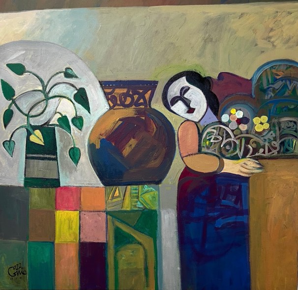 Above, Untitled 2, acrylic on canvas, one of three works by Mohammad Abdallah Otaybi, born 1948, exhibited in Disturbance in the Nile, Madrid 2024. This vibrant, taut work encapsulates many of Otaybi’s signature themes and motifs; the tense interplay of Sudanese Arab-Islamic and African cultural esthetics, the theatrical and the mythical; the masked features of Sudan’s African heritage set against richly textured panels of colour, adorned with abstract, geometric motifs. Here too are hints of Arabic calligraphic forms – evoking the sheltering power of the Sudanese Sufism Otaybi believes bonds and unifies his homeland.