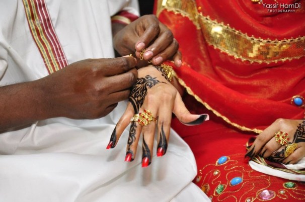Below, the bridegroom fastening a wedding bracelet on his bride’s wrist. Yassir HamDi, CC, Wikipedia.