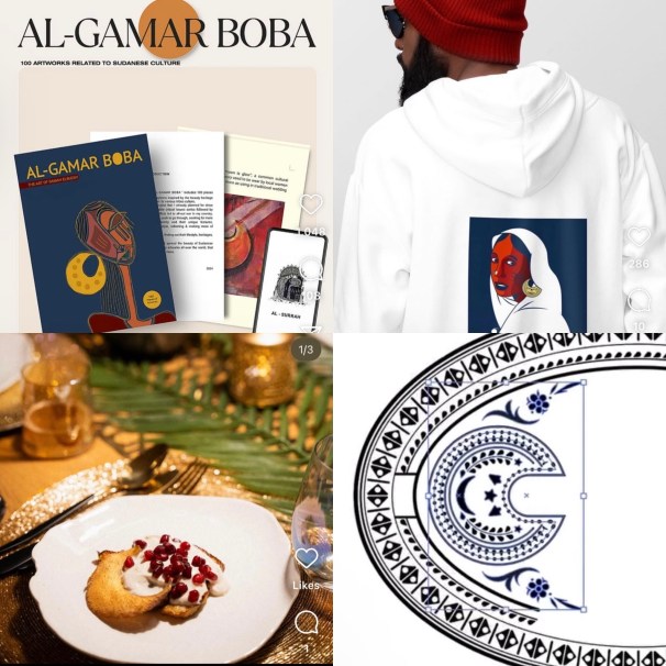 Top left, sama7arts publication with its beautiful imagery based around the gamar boba. Lower left, a delicate culinary tribute to the gamar boba by Sudanese Tokal. lower right, a bag motif for Sudanese clients inspired by the gamar boba, by Meisa Brands.