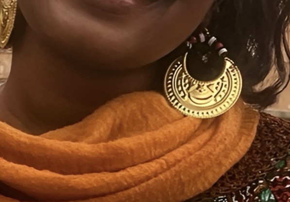 Above, and title photograph, the glowing gold crescents and beaded hoops of gamar boba earrings, joyfully worn by a young woman in 2022. In recent years the gamar boba, also known as fi/adaw, fidayat, have been donned with pride in homage to the visibility and values of pioneering Sudanese women entering post-independence public life. Worn too as a badge of nostalgia for a lost aesthetic and embodiment of femininity, for many younger Sudanese the gamar boba conjures up a host of tender associations with the wisdom and dress of their grandmothers. In the heady days of the 2019 revolution, wearing the gamar boba became a totem of faith in a renewed Sudanese identity striving for inclusivity while anchored in tradition.
