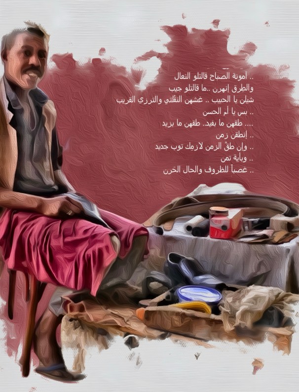 “I remember there was a young man who used to come to me every week to sew up the same shoe in the same spot until I finally got fed up. The last time I couldn’t even find a place to put the needle in because the shoe was too worn out so I got up and threw the shoe in the rubbish and then took off one of mine, that was new, and gave it to him – to please God. He was so happy and he left me and never came back.” Ibrahim speaking to Mahasin Ahmed Abdullah, Al-Rakoba, as above.