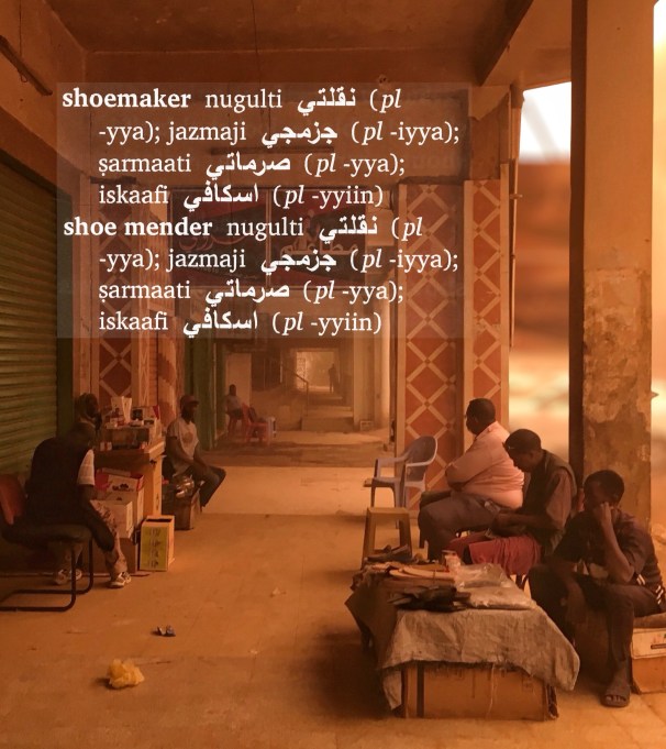 Below, the nugulti or shoe repairer bends over his work at his neatly laid out stall as ochre dust descends on a storm-hushed colonnade off Zubeir Pasha Street, central Khartoum. A few hours earlier a fierce sandstorm or habuub had grounded flights and blinded the capital in gritty orange haze. The definitions below come from Rianne Tamis and Janet Persson’s Concise Dictionary of Sudanese Arabic. As the lexicographers note, the term nugulti may be used for both a shoemaker and shoe repairer.