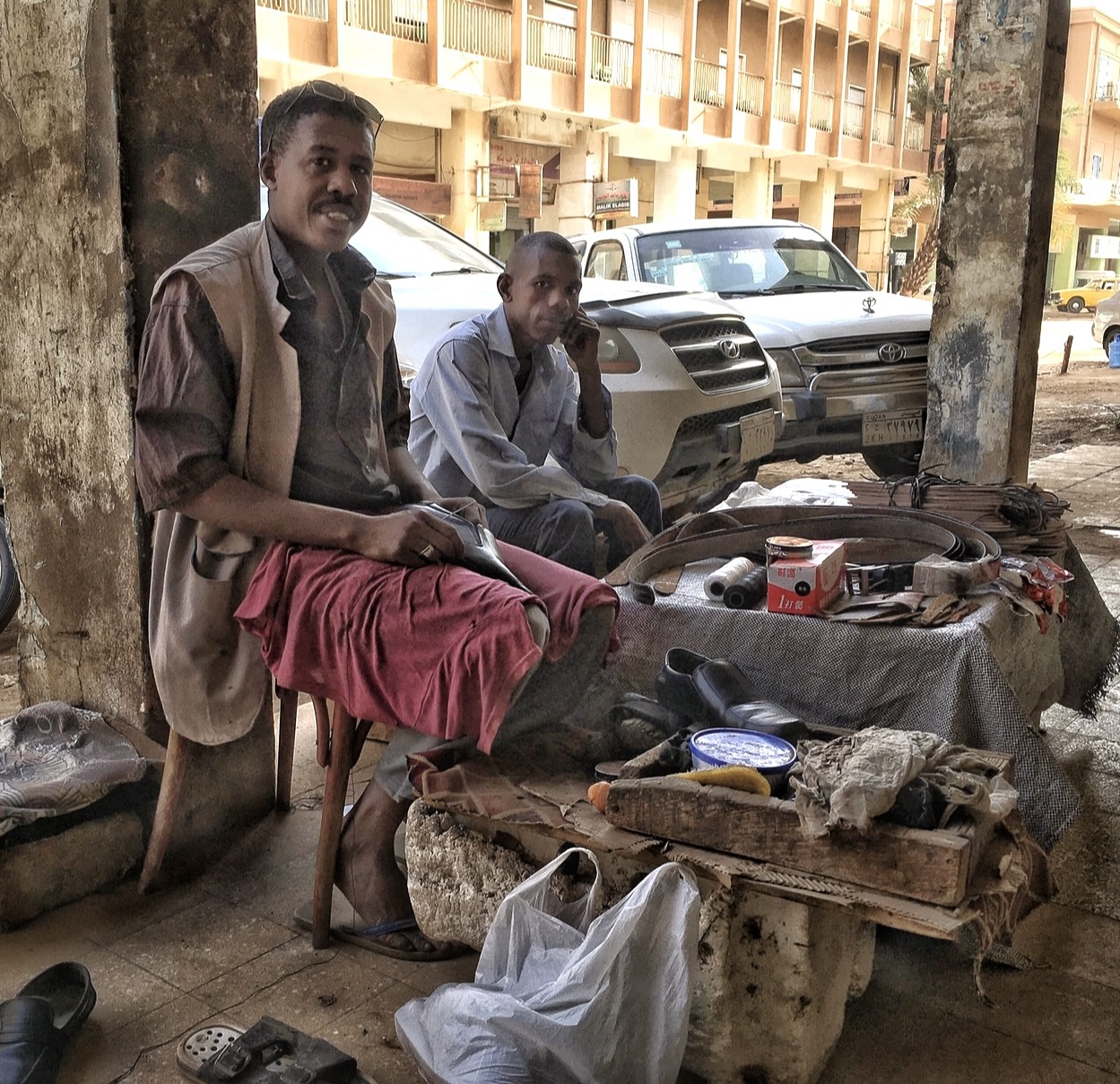 In recent years, in such economically precarious times, the nugulti’s skills, once in decline, are in demand again. Ever more shoes are resoled, reheeled and seams re-sewn under the nugulti’s skilled hands and even new shoes are brought in to be double-sewn to extend their lives. The same Ibrahim who offered his foot-weary customer his own shoe above has a face etched with “weariness, hardship and fatigue”, Al-Rakoba recalls. While he survives on his work, he barely makes a living. Let’s hope life gets easier for all Sudan’s shoemakers, shoe repairers and shoe shines.