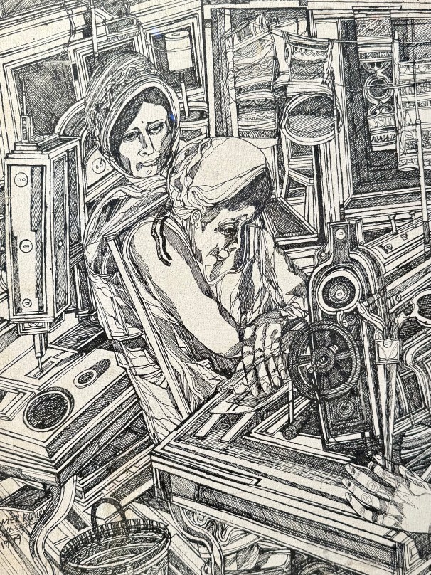 Above right, Mohammad Hassan’s study of Omer Khairy; upper left, photograph and self-portrait of the artist, Wikicommons and Sudan Memory; above left, detail from Omer Khairy’s Sewing Machine, featured below.