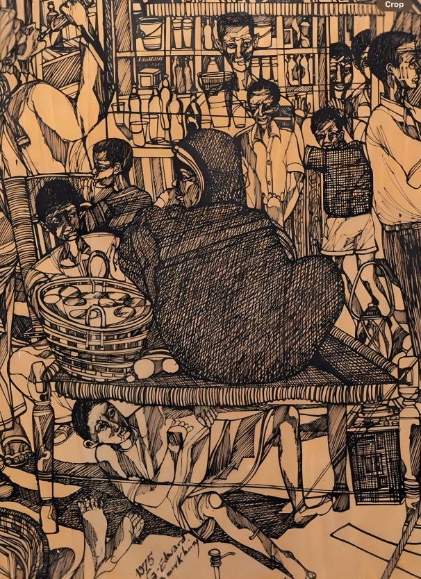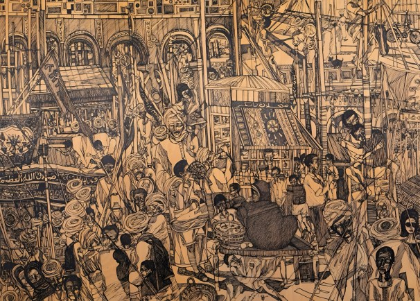 Above, detail from Untitled, (market scene). The internationally acclaimed artist became noted early on for the textural qualities of his black and white ink works on wood and paper. He frequently found inspiration in Sudanese street, harbour and fishing scenes, a style he evolved in the 1970s – 80s, Sudan Memory.