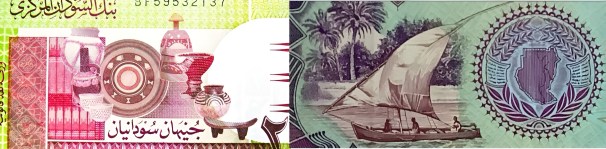 Above, emblems of Sudan, detail from Sudanese bank notes.