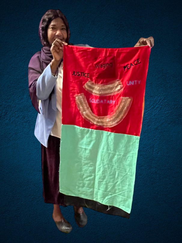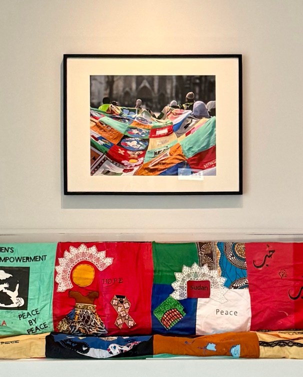 Featured in the exhibition is the beautiful Peace by Piece toub, shown above, testimony to the agency of Sudanese women in peace building. The Peace by Piece toub is an initiative supported by Waging Peace, supporting Sudanese asylum-seekers, refugees, and the wider community to build meaningful lives in the UK. See the remarkable impact of the toub on International Women’s Day last year in Women for Peace in Sudan.