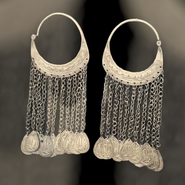 Below, pair of silver earrings from the Misiriya, Arabs of El Jeneina, Darfur.