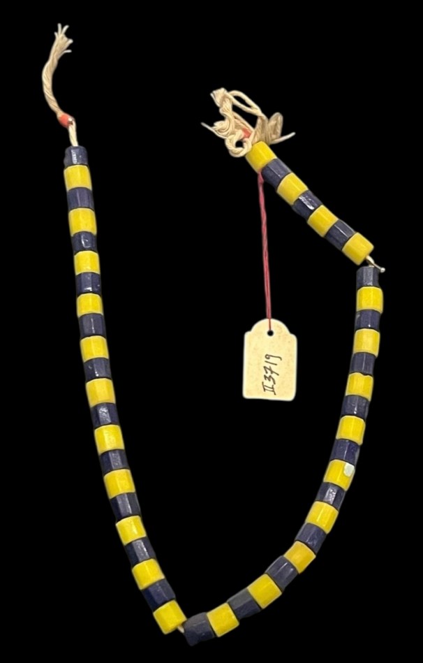 Below, necklace of yellow and blue beads made and worn by women of the Blenga tribe, South Kordofan.