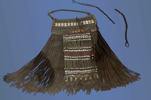 Below, elaborate belt embellished with cowrie shells, worn by men and women of the Blenga tribe South Kordofan.