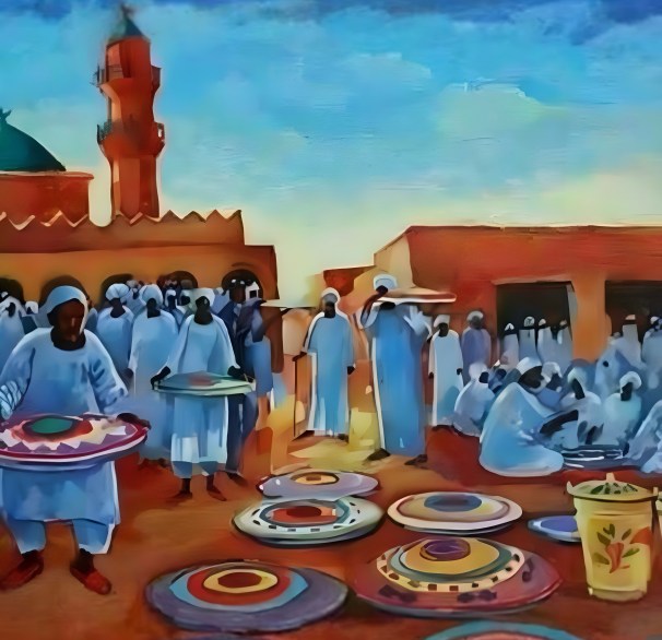 The large tabag is most often associated with joyful communal hospitality such as public Ramadan Iftar gatherings, as in the painting below. Artists, graphic and textile designers, cultural commentators, influencers and young revolutionaries have all tapped into the tabag’s multiple cultural resonances; tabag halos illuminate Sudanese historical and contemporary heroines in profile, tabag sun discs hang over emblematic and ancient landscapes; reassuring touchstones of enduring Sudanese values in times of upheaval.