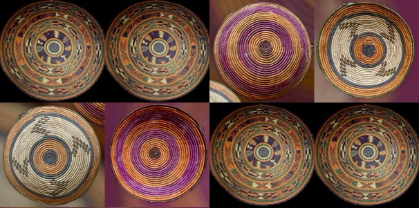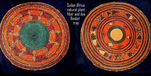 Above, a collage of small, individual woven dish covers or tabags (personal collection) and exquisitely patterned large tabag for covering trays of dishes served at communal events such as weddings, the latter on display at Sudan Ethnographic Museum, Khartoum, pre-war.