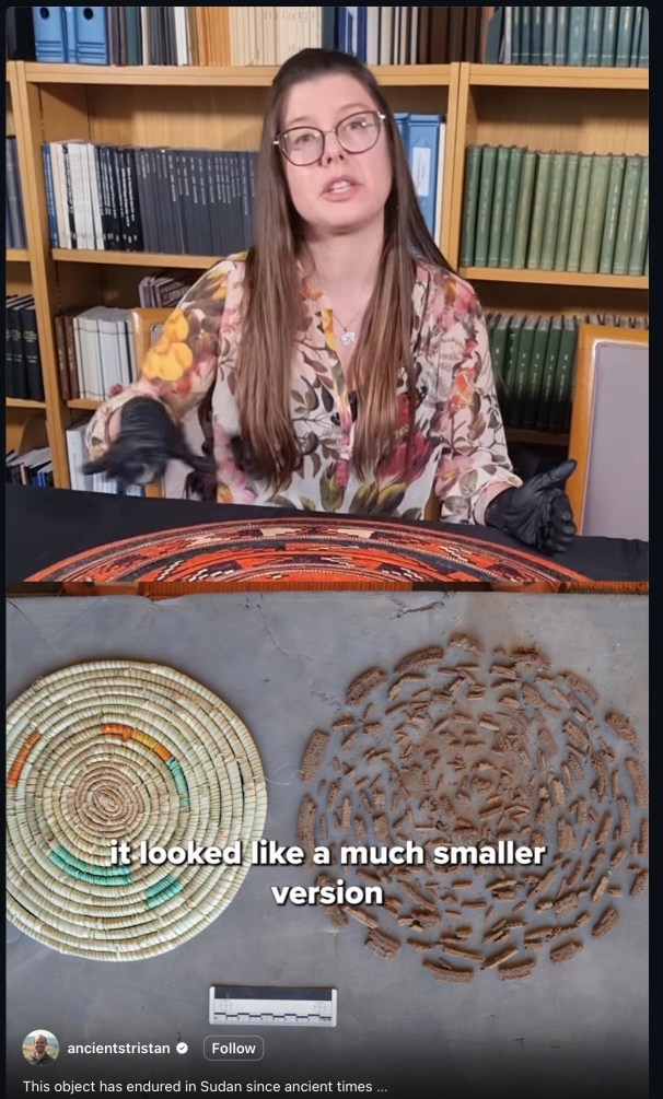 Curator at the British Museum, Dr. Loretta Kilroe, speaking in the context of the museum’s 2024-5 “Ancient Sudan: enduring heritage” touring exhibition, discusses an exquisite example of a modern Darfuri 40-day tabag in the instagram link above. She also explains that during excavations she found the remains of a smaller version preserved in a jar dating back to the Egyptian New Kingdom, indicating that the tabag as been used in Sudan for at least three thousand years.