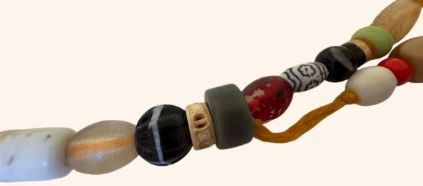 Below, a contemporary strand of hagoo beads with fish vertebra.