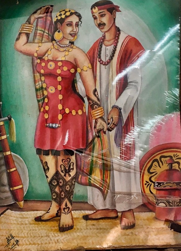 Describing jirtig adornments, Zenkovsky writes “the jirtig is a bunch of reddish-purple silk threads with a tassel dependent from it. On the silk are threaded the following always in the same order:- (1) A very large green bead, (2) a fish vertebra (killi), (3) a small white bead (raheimi), and (4) a medium-sized pale green bead (suluk). The jirtig is worn by both the bride and the bridegroom on the right forearm. The bride also wears on her right wrist a string of red beads called damarāt, and the bridegroom wears on his right wrist a silver bracelet (suwār) of the same size and shape as the bride’s anklet. The jirtig is worn by the man for nine days – a week is considered sufficient for government employees – and by the woman for a month.” Above left, a Sudanese wedding scene; a painting for sale in Khartoum.