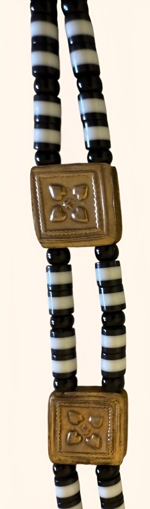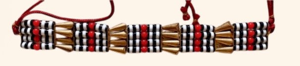 Above, a modern matarig or agate bead high choker necklace. The matarig was typically composed of four parallel rows of cylindrical agate beads alternating with long barrel-shaped gold beads called shayir, little bars of gold called rakaiz or conical beads known as jitti* (Source Griselda El Tayib). It might also feature flat square hollow beads of beaten gold, known as jakkid, threaded onto two parallel black cords.