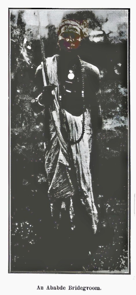 “On the ring finger of his right hand a silver ring with a large red stone in it. Round his neck four necklaces one of black and white beads (somīt) and gold beads, a second of red silk with large tokens called fragallahs and a small one called a bunduki, a third also of red silk with a slip from a palm branch tied to it – another rare addition, and a fourth of the usual rosary type. Round his temples a handkerchief to prevent the unguents with which his head has been anointed from trickling down his face. A whip in his right hand and the unsewn tōb, dress-length, complete the attire of this particular bridegroom, but he should properly be carrying a sword and the wedding garment of the well-to-do is of fine silk with borders such as only women usually wear.”