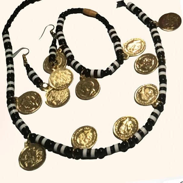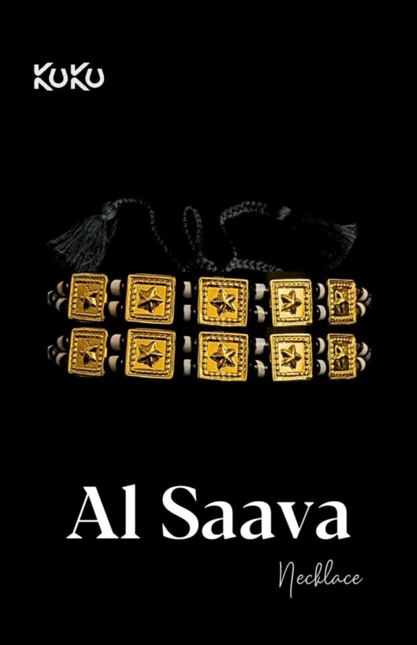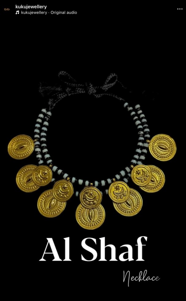 Left, a pair of stamped metal fadayat adorn the upper part of a young woman’s earlobe in a widely reproduced Pinterest image. Griselda El Tayib noted that the fidayat would often be complemented by a heavier, gold mugtal, worn at the base of the earlobe. She notes that in 1960s, the fidayat’s popularity waned and many were beaten down into ghuwaishat bracelets. See too The Gamar Boba Part 1. Above left, a colonial – era photograph of a young woman wearing a necklace of conical gold shayir beads interspersed with gold coins or tokens. Above right, a young woman is adorned with an agate teela necklace. Right, Al Saava, Nisreen Kuku