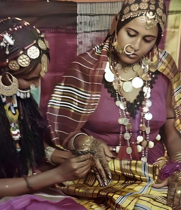 Above, a widely reproduced photograph (circa 1950 -1970s) of a Sudanese bride decked in her wedding finery and draped in her silky red and gold garmasis stole. She watches intently as her companion traces intricate, lacy motifs in henna on her hand. She wears a small gold nose ring or zumām, which when worn attached to a gold chain often studded with small discs or tiny glinting pendants is known as zumām abu rashma. Sudanese costume expert Griselda El Tayib notes that the zumām would later fall out of fashion, often being replaced by a gold stud in the shape of a flower bearing a stone centre piece.