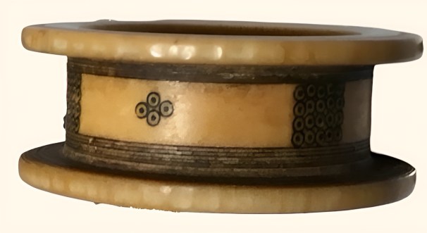 Colonial accounts also speculate on the origin of the jirtig, venturing to suggest that it recalled the “necklaces that bedecked the dead in ancient days.” They also explored regional differences in the custom, noting for example seeing on one occasion a small ostrich feather being stuck through the bead; a “rare addition in Khartoum but common in the Nuba Mountains.” They reference too the protective gold crescent moon Hafaz medallion “suspended on a string of red or blue material hung on the brow of the bridegroom.” Right, Nisreen Kuku Jirtig, showing gold tipped “somit” agate bead pendant. See too Nisreen Kuku EL Haryra.