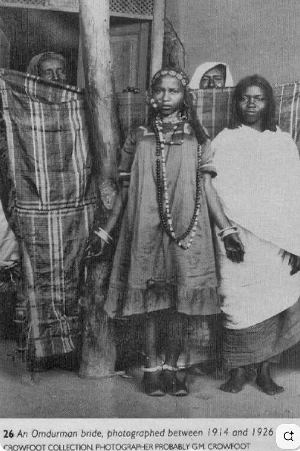 Above, a life-changing moment of tenderness and vulnerability captured; an Omdurman bride on her wedding day, 1914-1926, Pinterest, photograph attributed to G.M Crowfoot. The young girl holds open her hands to display her freshly hennaed palms and sin fil ivory cuff bracelets (more on these in coming posts). Her ankles are adorned with silver hijil anklets, described below. For more period portraits of Sudanese brides and grooms, see the work of pioneer Sudanese photographer Rashid Mahdi, and for example his Sudanese bride, wife of Malik Al Sheikh Mohammad Saeed.