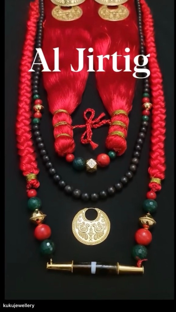 Describing jirtig adornments, Zenkovsky writes “the jirtig is a bunch of reddish-purple silk threads with a tassel dependent from it. On the silk are threaded the following always in the same order:- (1) A very large green bead, (2) a fish vertebra (killi), (3) a small white bead (raheimi), and (4) a medium-sized pale green bead (suluk). The jirtig is worn by both the bride and the bridegroom on the right forearm. The bride also wears on her right wrist a string of red beads called damarāt, and the bridegroom wears on his right wrist a silver bracelet (suwār) of the same size and shape as the bride’s anklet. The jirtig is worn by the man for nine days – a week is considered sufficient for government employees – and by the woman for a month.”