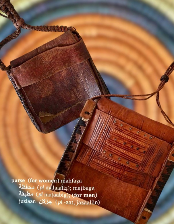 Above, the supple, finely tooled leather of much used mahfaza, also known in colloquial Sudanese as maHfaDa, محفضة. Facebook respondents have suggested that this type of traditional women’s purse or money pouch is also known as shukwa / shakwa in Nubian dialects, as tajbiriik in the Beja language, as Shonug in Mahas and is referred to as zaawiyya in Darfur, although the latter term is used differently below. The definition above comes from Rianne Tamis & Janet Persson’s Sudanese Arabic, A Concise Dictionary. The photograph of these mahfaza was kindly provided by Cate Evans-Paulmier.