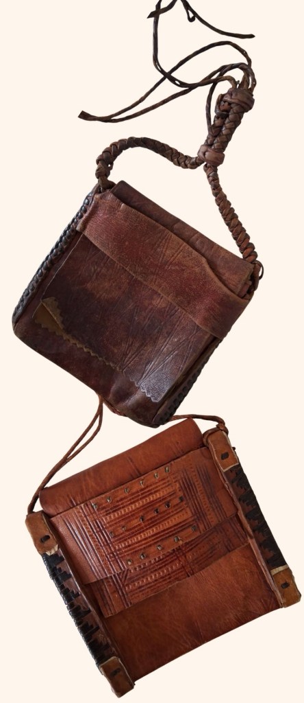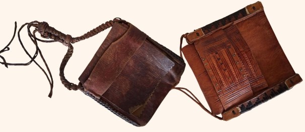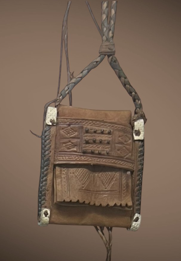 The money pouch or purse originally reserved for women contains at least two pockets within its folds, one for coins, the other for large denomination notes. A leather flap, an extension of the back panel, folds over the mouth of the pouch and is secured under a leather band. The purse is suspended by elegant plaited cords of leather as above or thick cords of red gittan (see below), often imported from Egypt. When these wore through, they would be replaced by sturdy twine or the plastic cord used for weaving bambar stools. Costume expert Griselda El Tayib notes that women working in the market would own many such purses, varying in size from 2-8 inches, often attaching precious amulets and household keys to their straps.