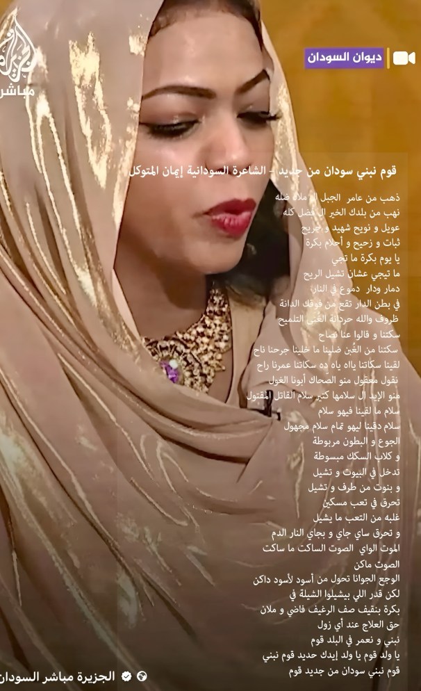 “قوم نبني سودان من جديد”.. الشاعرة السودانية إيمان المتوكل تلقي قصيدة عبر شاشة