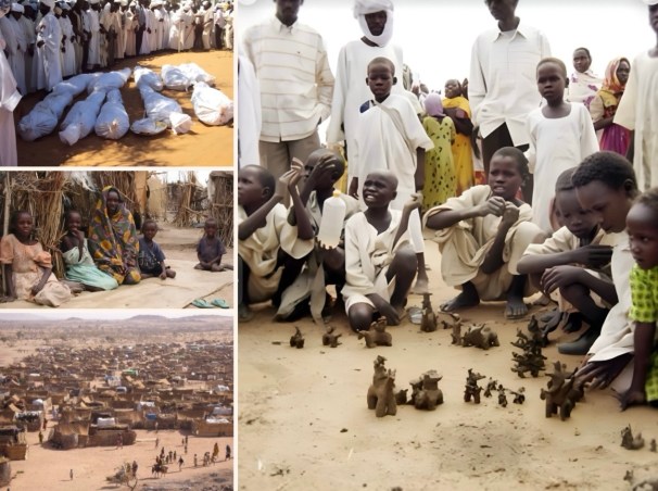 Above, visual testimonies to the cost of war; the dead and displaced of Darfur; young survivors being helped to overcome the psychological scars they have suffered, photographs, (CC), War in Darfur Wikipedia.